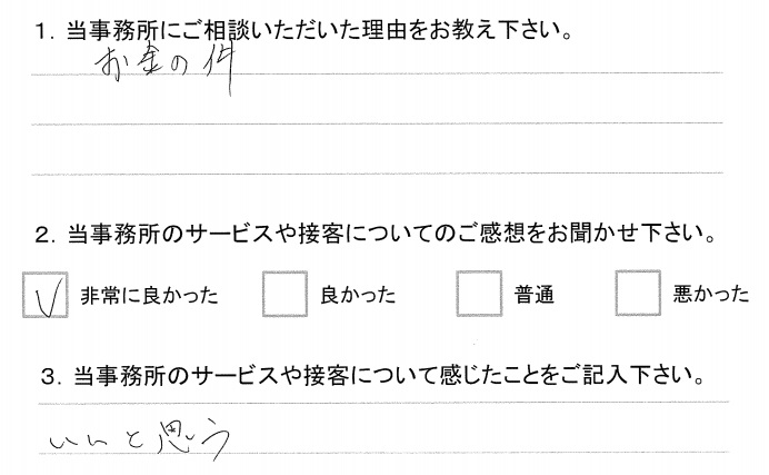 お客様の声① 労務問題 とてもていねいに接していただき、内容もよく理解できました。 ありがとうございます。