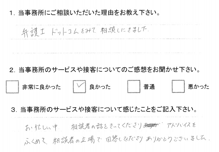 お忙しい中、相談者の話を聞いてくださり、アドバイスを含めて、相談者の立場で回答してくださり、ありがとうございました。